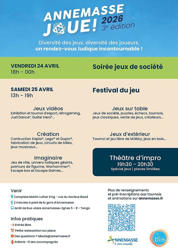 Jeux de société modernes, jeux vidéo, jeux de rôle, échecs, Mölkky, espaces familiaux, escape games… Il y en aura pour tous les âges, tous les niveaux et toutes les envies. Que vous soyez joueur débutant, confirmé ou simple curieux, que vous veniez seul, entre amis ou en famille, Annemasse Joue ! vous propose de partager un moment convivial autour du jeu. Cette édition 2026 sera rythmée par plusieurs temps forts incontournables !