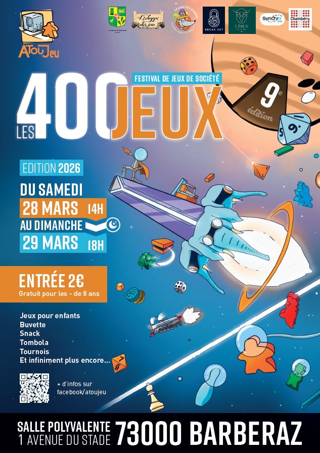 Venez jouer tout le week-end, non-stop, au festival Les 400 Jeux où de nombreuses animations seront présentes : tournois, prototypes, jeu à rôle caché (BOTC), tombola, bourse aux jeux, jeux experts, buvette et restauration sur place. Rendez-vous le 28 et 29 mars !