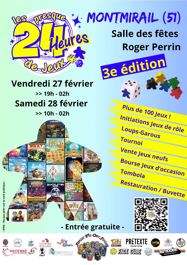 Les Presque 24 Heures de Jeux vous invite à découvrir une centaine de jeux de société, pour tout âge, de tous types (bois, XXL, plateau, cartes, dés…) et mécanismes (confrontation, coopération, collection, programmation, deckbuilding, conquête…). Avec aussi des animations : initiation au Jeu de Rôle, séances des Loups-Garous de Thiercelieux, Tombola et quelques petites surprises encore.