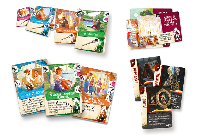 À chaque tour, les joueurs doivent planifier leur routine quotidienne et décider s’ils auront un rendez-vous galant, participeront à un événement social, rencontreront leur muse, créeront de nouvelles œuvres ou… iront travailler. Chaque carte leur offre divers bonus et inspirations ; une gestion rigoureuse de leur réserve et de l’ordre dans lequel elles sont jouées est donc essentielle pour maximiser leur inspiration. Les joueurs dépensent ensuite leur inspiration pour acheter des cartes et enrichir leur deck avec de nouvelles habitudes, des muses inspirantes ou de nouveaux succès professionnels. L’artiste qui obtient le plus de succès du deck de succès remporte la partie.