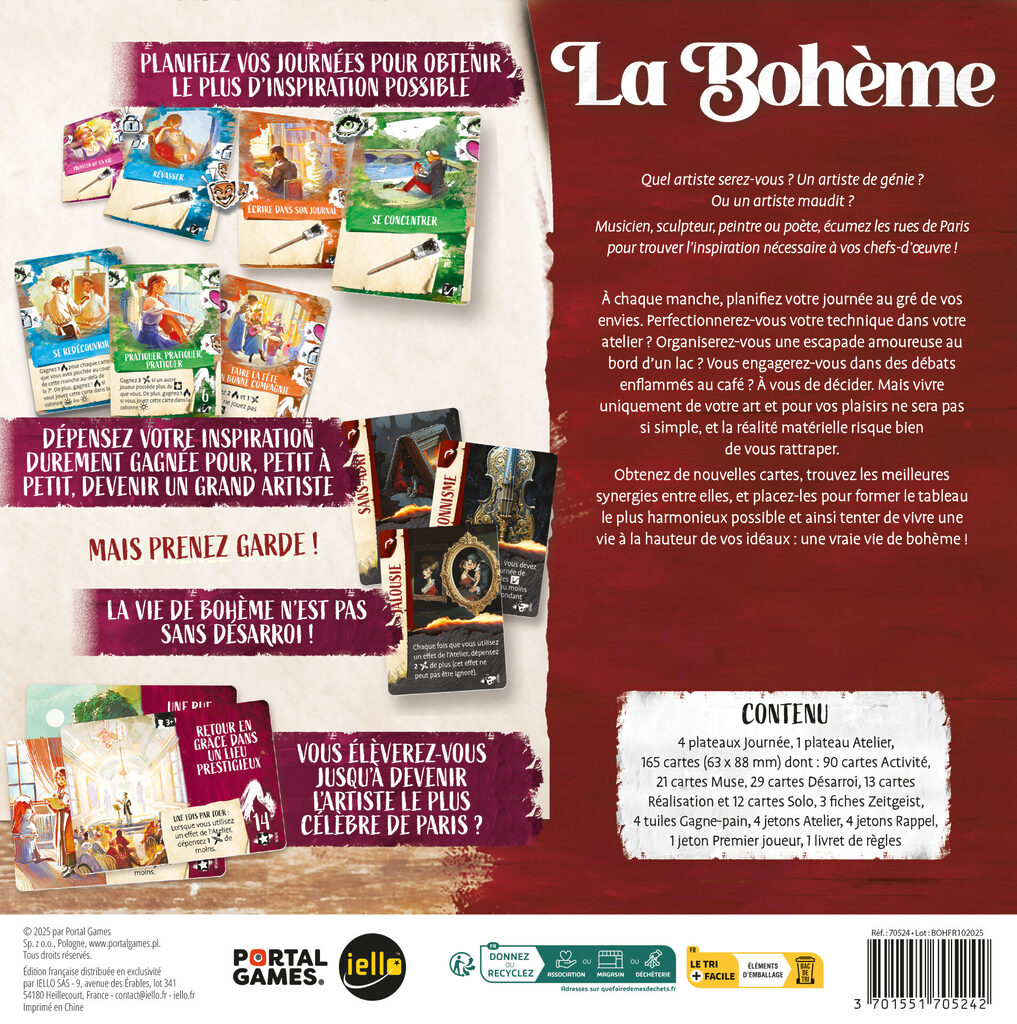 Dans La Bohème, les joueurs incarnent des artistes errant dans les rues de Paris au tournant des XIXe et XXe siècles, s’efforçant de créer des chefs-d’œuvre tout en relevant les défis du quotidien. La Bohème est un jeu de cartes où les joueurs collectionnent des cartes pour trouver l’inspiration, chercher des muses et gérer les tâches du quotidien.