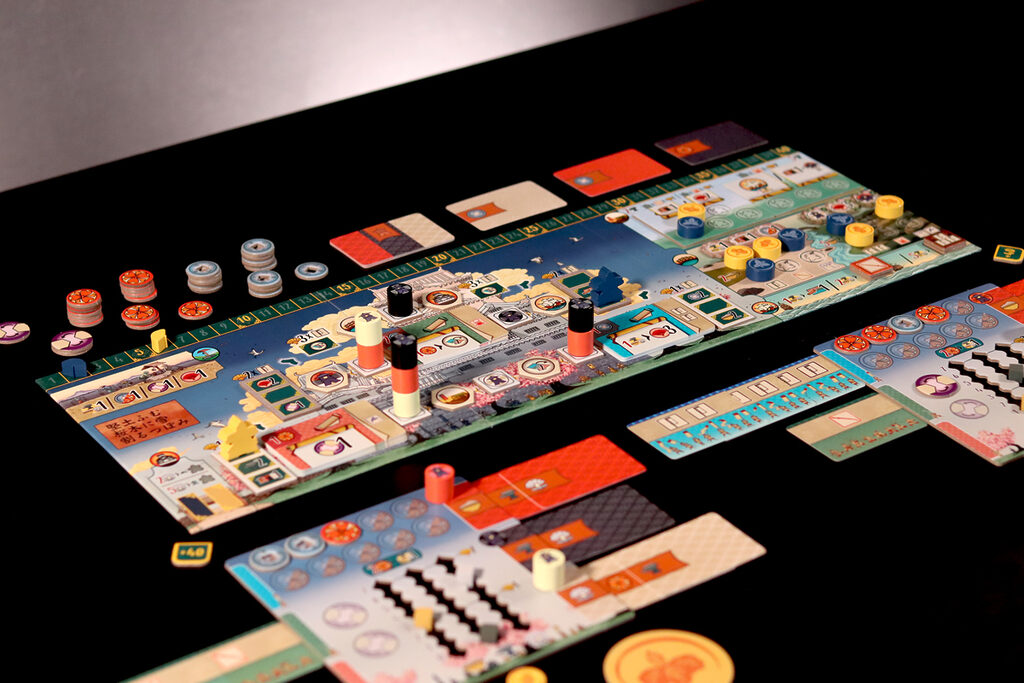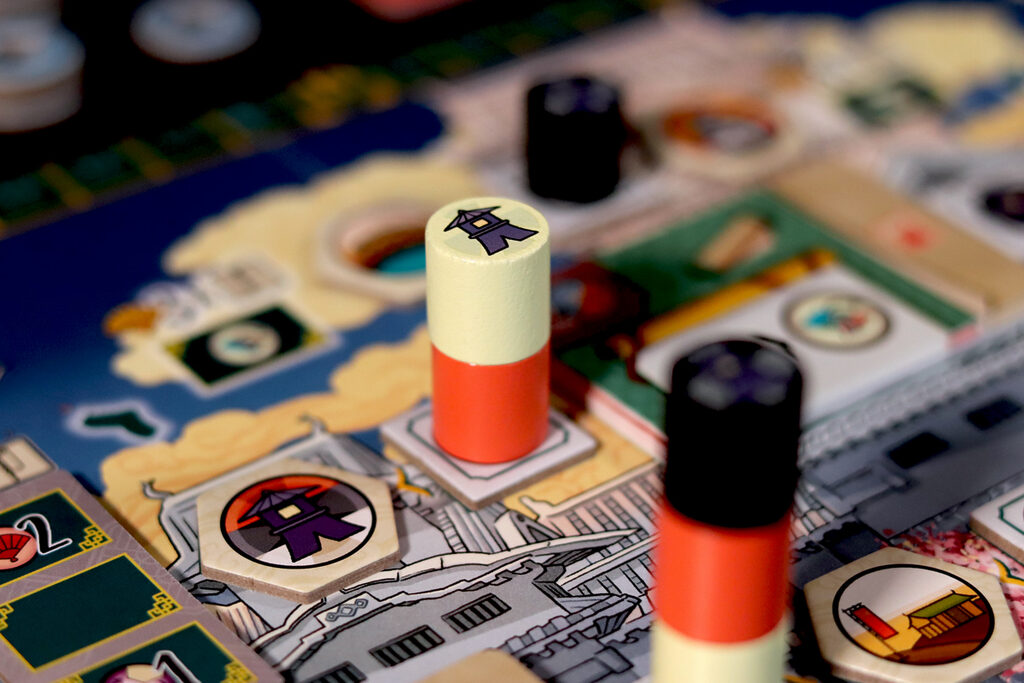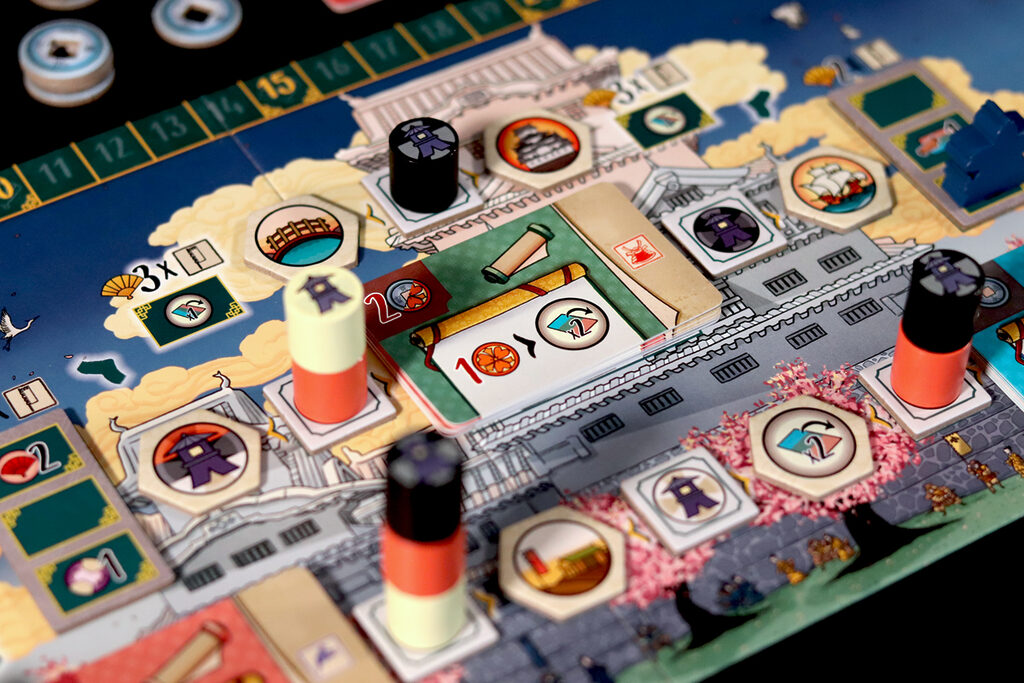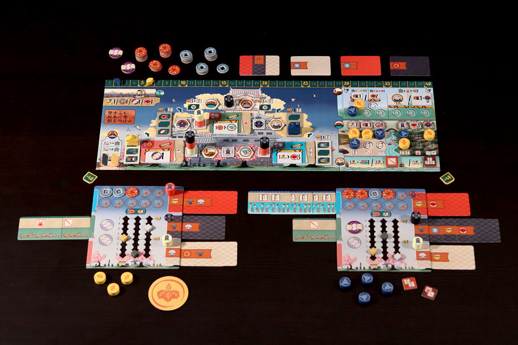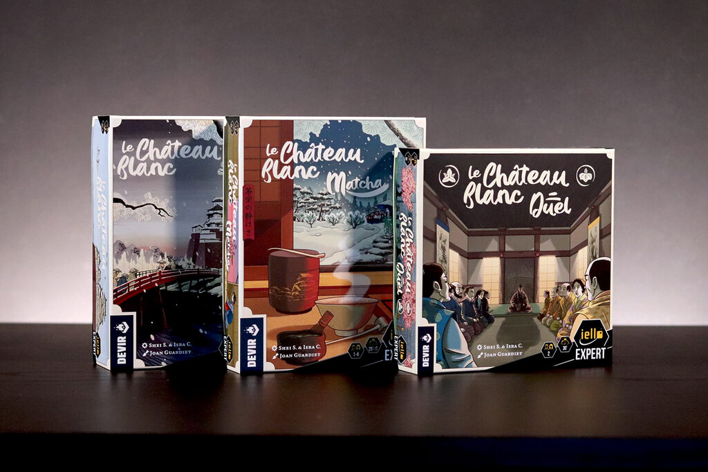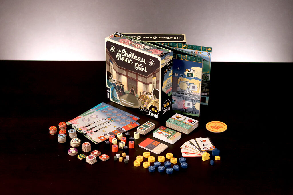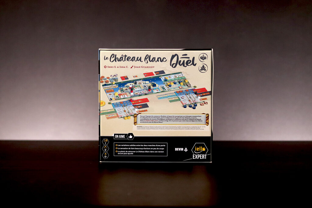 Dans Le Château Blanc – Duel , deux clans s’affrontent pour exercer leur influence à la cour du Héron Blanc, en gérant les ressources et en faisant preuve de stratégie. À chaque tour, vous utiliserez leurs jetons Lampe pour obtenir des ressources et activer des actions. Parmi les actions disponibles, vous pouvez acheter et améliorer des cartes Influence, placer des sceaux de clan sur les jardins et les terrains d’entraînement, déplacer votre courtisan entre les cercles d’influence ou commercer avec les Portugais. Ces actions vous permettront d’accumuler une série d’icônes – drapeaux, katanas, kabutos et origamis – qui vous rapporteront des points. Le vainqueur est celui qui en obtient le plus.