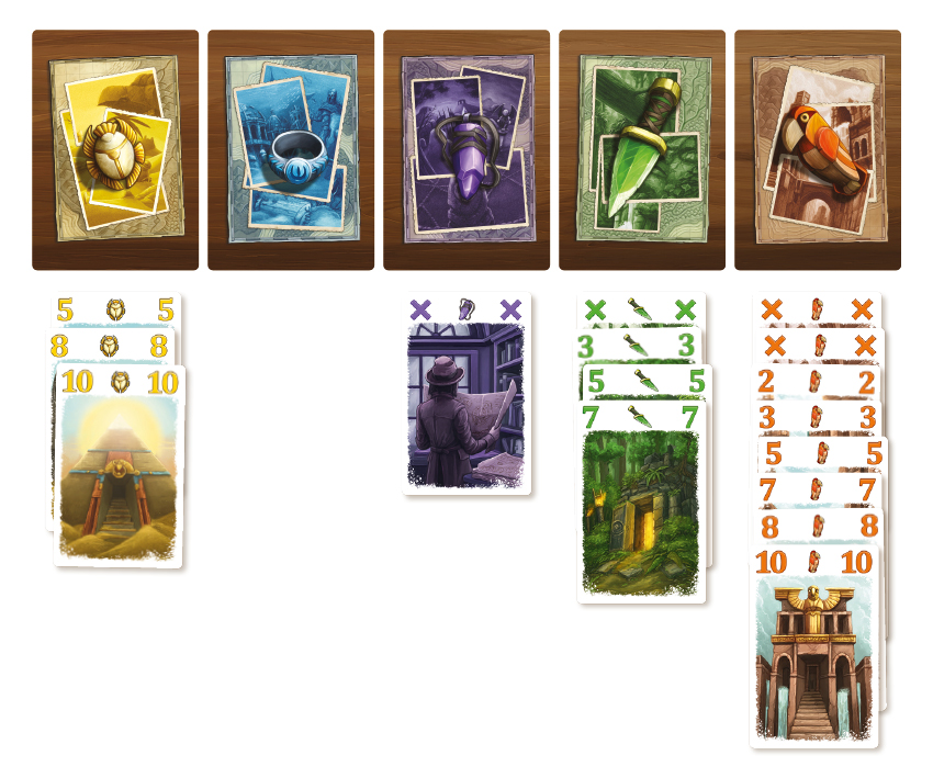 Autre différence avec le Lost Cities originel : les expéditions dont désormais divisées en 5 couleurs (contre 6 dans la version d’origine) afin de booster le rythme des parties, et le plateau de jeu a été remplacé par des tuiles.