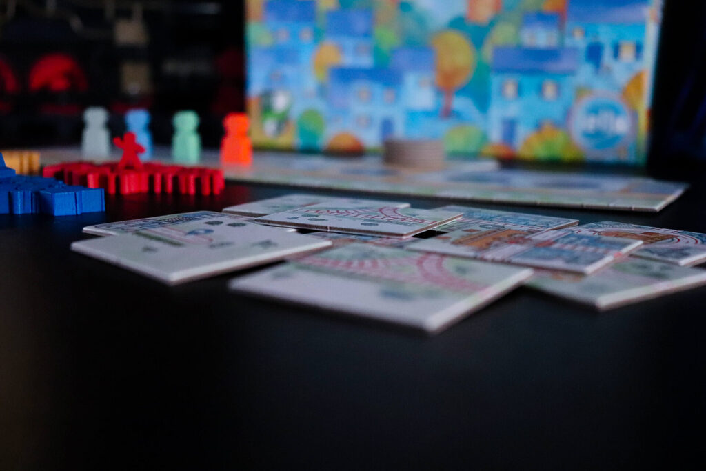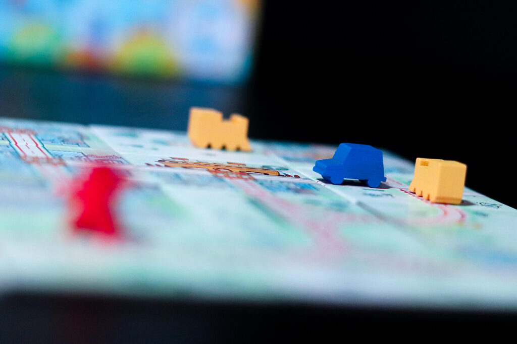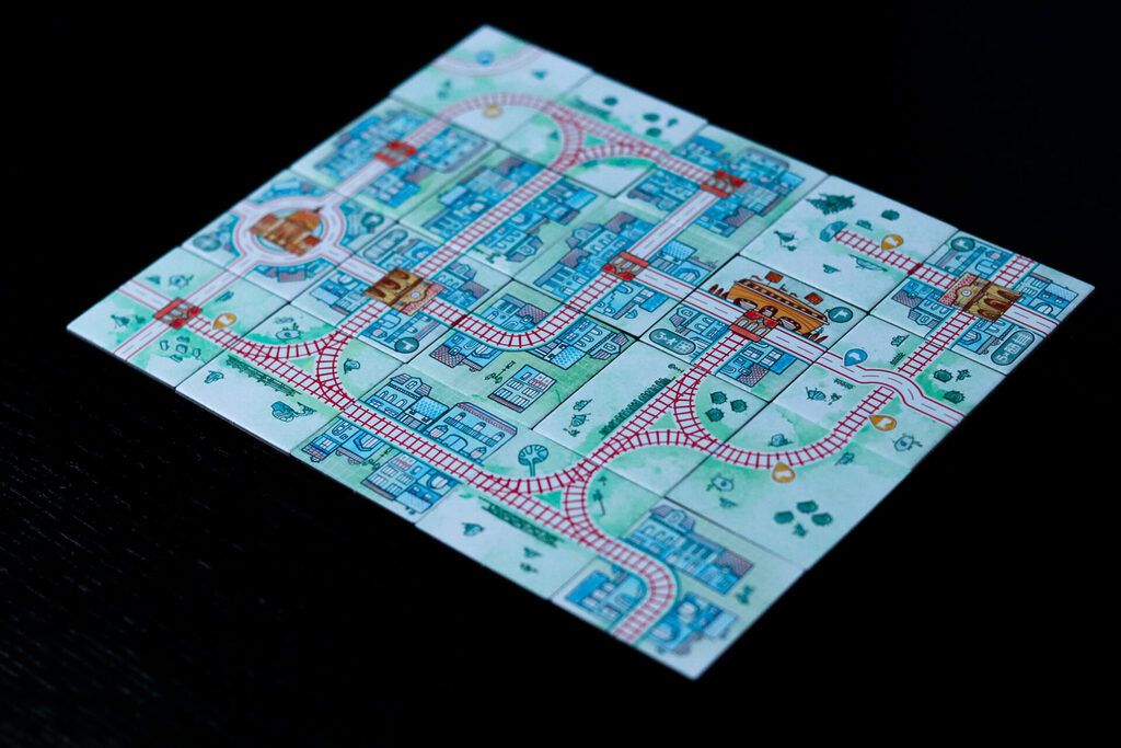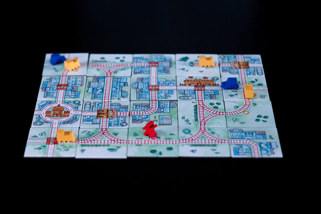 À chaque manche, vous pouvez également placer des voitures, des trains ou des voyageurs pour peupler le petit paysage que vous créez, à condition d’avoir de la place libre sur vos tuiles. Les actions disponibles changent d’un tour à l’autre, vous devez donc vous préparer à l’avance !