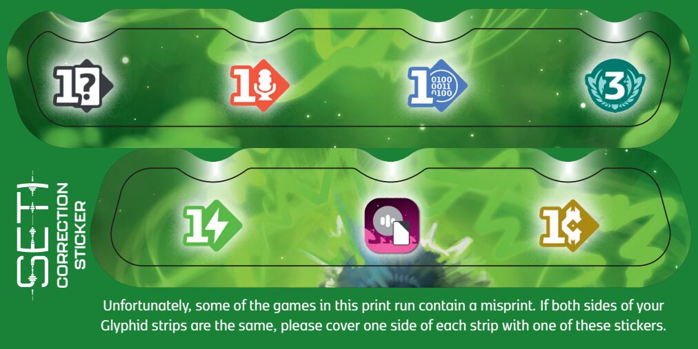 Hélas et patatras, deux éléments issus d’une nouvelle race alien, les glyphides, sont possiblement mal imprimées. En effet, afin d’ajouter de la rejouabilité, les deux bandes à insérer dans le plateau des Glyphides sont prévues pour être recto/verso. Toutefois, un certain nombre de boîtes issus du premier tirage comportent des bandes identiques, au lieu d’être différentes sur chaque face.